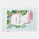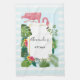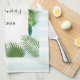 Une serviette de cuisine avec un flamant rose mignon et capricieux. Entouré de feuilles tropicaux verts, de fleurs d'hibiscus rouges et jaunes. Un cadre de dégradé doré en forme de rectangle au centre.