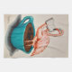 A flamingo stands in a cup of coffee (or tea) to read a book. Original art handmade by Sue Clancy using ink and gouache.