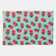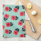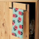 Serviette de cuisine aux motifs floraux rouges et bleu aqua.