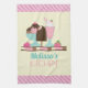 Serviette de cuisine personnalisée sur le thème de la crème glacée sucrée. Bandes diagonales roses le long de la bordure supérieure et inférieure. Illustré avec un bar à crème glacée au chocolat, un sundae à 3 boulettes avec une cerise sur le dessus, et un flotteur à fraise avec de la crème fouettée. Petites fraises et cerises sur le fond. Arrière - plan jaune pâle. Rafraîchissant gâteries chaudes.