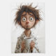 Illustration fantaisiste et relatable d'un homme débraillé en peignoir serrant une tasse de café aux yeux larges et fatigués. Ses cheveux désordonnés et son expression perplexe capturent parfaitement le chaos des premiers matins avant que la caféine ne prenne effet.