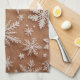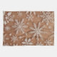 This delicate composition celebrates the intricate beauty of nature through a series of highly detailed snowflakes set against a warm, sandy ochre background. Each snowflake is rendered with fine, lace-like precision in a crisp white, creating a striking contrast that emphasizes their unique hexagonal symmetry. The background features a subtle, speckled texture reminiscent of falling frost or a light dusting of snow, while the overall warm tone lends a sophisticated, vintage holiday aesthetic to the piece. The arrangement is organic yet balanced, capturing a frozen moment of winter elegance.