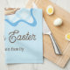 Celebrate Easter with this adorable design featuring a charming brown bunny nestled inside a beautifully decorated teapot, adorned with delicate flowers and a sweet pink bow. A tiny Easter egg adds to the festive spirit. The whimsical illustration is framed by a lovely light blue gingham pattern and a scalloped border, with "Happy Easter" scripted gracefully below. This delightful design is perfect for spring gatherings, Easter egg hunts, or simply spreading joy. Add your family name.