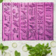 Un ensemble de serviettes de cuisine violettes avec des hiéroglyphes anciens gravés sur pierre.