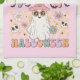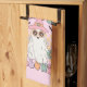 Joli, coloré, amusant Hippie Halloween serviette de cuisine dispose d'un fantôme hippie avec casquette de sorcière rose, texte qui lit Hippie Halloween, et quelques fleurs et petites chauves-souris et crânes en lavande, melon, aqua, et rose!