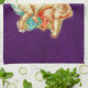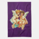 Serviette de cuisine avec une paire de petits anges chérubins doux avec des ailes blanches douces et habillés de vêtements diaphanes. L'un chuchotant tranquillement à l'oreille de l'autre. Fond abstrait violet.