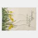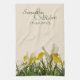 Un teatowel avec une photo de bucharica jaune et blanc d'iris avec le feuille vert sur un arrière - plan crème, avec les modèles des textes à compléter de noms de jeune mariée et de mariés et la date de l'événement, pour un cadeau nuptiale de douche, de mariage ou d'anniversaire. Papeterie assortie de mariage avec la même conception disponible.