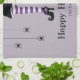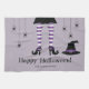 Illustration de l'Halloween de Destei : jambes de sorcière rayées violettes et blanches. La sorcière porte une jupe noire et des chaussures noires. Les chaussures ont quelques détails violets dessus. Il y a aussi un casquette de sorcière à côté de la sorcière et trois araignées accrochées à droite. Il y a aussi deux zones de texte personnalisables. L'un des exemples de textes dit : "Happy Halloween !" tandis que l'autre donne de l'espace pour un nom de famille ou un autre texte personnalisé. La couleur arrière - plan est violet clair, mais elle peut être changée en n'importe quelle autre couleur, si vous le souhaitez.