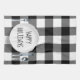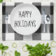 Happy Holidays texte sur une plaque ronde blanche et argenterie sur un arrière - plan blanc et noir de buffle plaid. Le texte peut être modifié.