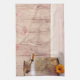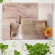 Une serviette de cuisine au design rustique et campagnard. Un vieux lait rouillé peut avec une jolie fleur de gerbera orange à côté. Blé et pavots rouges estampillés dans l'arrière - plan dressés contre un panneau en bois. Le bois n'est qu'une image, pas réel.