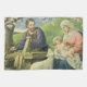 Illustration vintage de thème religieux représentant l'atelier de Joseph avec la Vierge Marie et un bébé Jésus-Christ nourrissant un agneau.