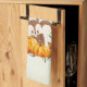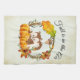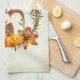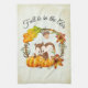 Serviette de cuisine avec un design typographique qui dit que Fall est dans l'air. Illustré par un adorable écureuil debout derrière quelques citrouilles orange aquarelle. Une couronne feuillue les entoure d'une feuille de chêne, d'un cordon, de fleurs d'orange d'automne et d'autres sprigs et feuilles. L'Arrière - plan est un vintage blanc cassé aux bords marron clair vieilli.