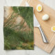 Une serviette de cuisine avec une photo représentant un mignon petit renard à fourrure rouge et blanche. Entouré de feuilles et d'herbes verdoyants.