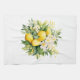 Kitchen towel with a lovely illustration of a bouquet of lemons surrounded by white blossoms leaves and sprigs.