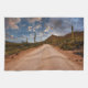 Cette photo extraordinaire de Getty Images présente un chemin de terre et le parc national du Saguaro menant à un beau coucher de soleil nuageux avec des cactus en saguaro bordant la route.
