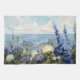 Un doux tableau côtier fleuri dans les pastels clairs, avec des fleurs violettes, bleues et blanches avec une végétation délicate et une vue paisible sur la mer au loin, parfait pour les maisons de style cottagecore ou côtier.