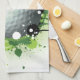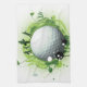 Grunge style shades of green, golf design, featuring in your face golf ball with splats and leaves aroet it and golfers with golf bags main, standing on the surface of the golf ball with golf flags out .