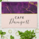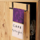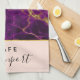 Serviette de cuisine personnalisée avec une belle motif abstraite au design marbré. Des couleurs violettes riches se mélangent avec des rubans tourbillonnants d'or faux, mélangeant et mélangeant les couleurs tout au long du design. Une couche de couleur pêche sous le motif avec une bande d'or-feuille élégante entre eux.