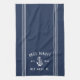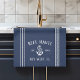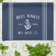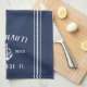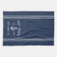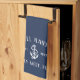 Customisez votre galerie de bateau avec cette mignonne serviette de cuisine personnalisée portant votre nom de bateau, le registre du navire et l'année établie en blanc accentuée avec une illustration d'ancre sur un arrière - plan bleu marine classique.