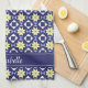 Serviette de cuisine moderne à motifs floraux marocains bleu et jaune. Personnalisez avec votre nom.