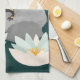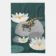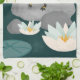 A detailed and naturalistic flat-style illustration of a fire salamander — rendered in dramatic black with vivid yellow spots — crawling across smooth grey rocks, surrounded by elegant white water lilies in a deep teal pond. The high contrast between the salamander's markings and the soft background creates a striking visual. This art piece appeals to nature enthusiasts and collectors of unique botanical and wildlife art.