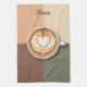 This personalized kitchen towel has a clean, top-down view of a mug filled with a meticulously crafted coffee beverage, featuring classic heart latte art in the foam.. The design is set against a modern, quartered background of warm, complementary colors. Ideal for baristas, coffee lovers, cafe owners, or anyone seeking stylish, contemporary kitchen and coffee station decor.