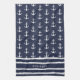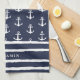 Cette serviette de cuisine en bleu et blanc marine monogrammée a un texte modèle pour le personnaliser avec votre nom. L'aménagement comprend un ancrage blanc et un motif à rayures dessinées à la main, ce qui le rend élégant et moderne pour la cuisine de la maison de plage ou le yacht.