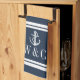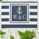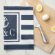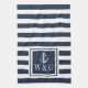 Élégant torchon de cuisine à monogramme personnalisé avec ancre et motif rayé bleu marine et blanc avec vos initiales de monogramme dans un carré bordé de bleu marine. Conçu par Thisisnotme©