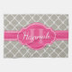 Motif en treillis gris et blanc élégant et tendance dans l'arrière - plan, surmonté d'un étiquette rose chaud avec un nom personnalisable et un modèle monogramme.