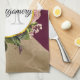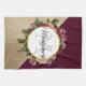 Serviette de cuisine avec un motif en marbre doré et une solide couleur bordeaux en diagonale. Un cercle avec une bordure en feuille d'or qui est superposé sur un joli bouquet fleuri avec roses, oeillets et autres fleurs. Personnalisez avec votre nom et monogramme à l'intérieur du cercle.