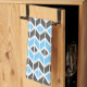 Cette serviette de cuisine est ornée d'un motif en os de hareng géométrique coloré en bleu ciel, gris foncé et blanc.