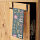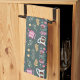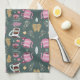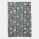 Patterned textiles with pink teapots, teacups, and green leaves on a dark background, shown in horizontal and vertical orientations. Cozy and whimsical.