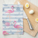 Une serviette de cuisine - un motif avec une ambiance estivale amusante. Flamants roses et ananas posés sur un motif rayé bleu clair avec feuilles et coeurs tout autour.