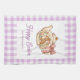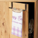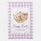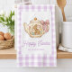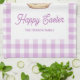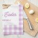Personalized Easter Bunny Teapot Gingham Family kitchen towel. Celebrate Easter with this charming and whimsical design. Features an adorable bunny beside a vintage-style teapot with a sweet pink bow and delicate spring flowers. Little Easter eggs complete the festive scene. The design is beautifully framed by a classic light purple and white gingham check border, adding a touch of rustic charm. Easily personalize with your family name for a unique touch.