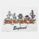 Les points de repère de l'enfouissement, à plus grand Manchester, l'Angleterre, comportant des versions stylisées d'un personnage de dessin animé de ses points de repère et paysage urbain, y compris (de gauche à droite) la tour d'horloge de bouton blanc, un transport pour un plus grand arrêt (TfGM) d'autobus de Manchester tenant un JD folâtre le sac de cordon, un boudin d'enfouissement traditionnel, et les sacs de transport d'un tram de Metrolink du marché de renommée mondiale d'enfouissement et de la roche, et en conclusion, le monument de peau tenant un béret d'un fusilier de Lancashire. L'enfouissement est défini en brique rouge et grès traditionnels, avec l'embellissement de fleur de coton.