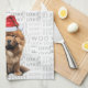 Here's a fun holiday kitchen towel with an adorable watercolor illustration of a Chow Chow dog who sits with a fun 'woof' word art background. The dog wears a Santa hat.
