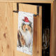 Voici une serviette de cuisine de vacances amusante ou une serviette à main toute l'année. Une adorable illustration aquarelle d'un chien de Collie assis avec un arrière - plan d'art de mots amusant. Le chien porte un chapeau de Père Noël.