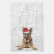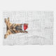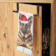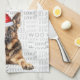 Voici une serviette de cuisine de vacances amusante ou une serviette à main toute l'année. Une adorable aquarelle illustrant un mignon chien allemand Shepherd Père Noël assis avec un amusant arrière - plan d'art de mots "woof". Le chien porte un chapeau de Père Noël.