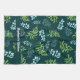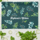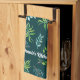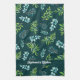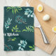 Cute, personalized kitchen towel in a pretty, blue and green watercolor floral design with a deep green background.