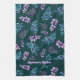 Cute, personalized kitchen towel in a pretty color pattern of pink, purple and aqua blue watercolor floral design on a pretty deep aqua green background.