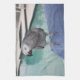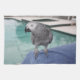 Perroquet de gris africain du Congo se tenant sur son poolside bleu de serviette et appréciant le soleil ! Plumes grises assez crantées sur un fond de vert et de bleu d'aqua. Perfectionnez pour l'amant d'oiseau dans vous !