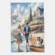 This enchanting coastal scene captures a dreamy sunset stroll along a golden shoreline, where soft waves kiss the sand and warm light dances across the water. A stylish couple walks hand in hand beside a fluffy companion, their silhouettes glowing against a pastel sky brushed with blush, apricot, and powder blue clouds. In the distance, a graceful sailboat drifts peacefully, while a grand seaside cottage rests atop a flower-lined bluff, surrounded by lush greenery and blooming garden paths. The entire composition feels like a modern cottagecore daydream infused with cozy coastal charm and a hint of boho romance. Gentle reflections shimmer in the wet sand, creating a luminous, painterly aesthetic that feels both whimsical and serene. This artwork blends soft realism with a storybook atmosphere, evoking feelings of love, tranquility, and slow living by the sea. Perfect for anyone drawn to romantic beach vibes, elegant seaside homes, and sunset wanderlust. AI generated artwork.