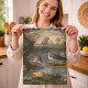 Tableau vintage d'une scène botanique avec grues bleues au bord d'une rivière entourée de belles grandes fleurs