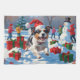 Illustration de vacances pleine de charme avec un chien gai jouant dans la neige, portant un chapeau de Père Noël et entouré de boîtes cadeaux colorées. Dans l'arrière - plan, les enfants construisent un bonhomme de neige à côté d'un sapin de Noël enneigé, créant un merveilleux pays hivernal. Parfait pour répandre la joie des fêtes et capturer la magie de Noël.