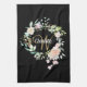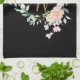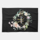 Jolie serviette de cuisine monogramme initiale, avec un beau nom de script blanc avec une initiale en or complétant qui est encadrée par une délicate guirlande rose florale aquarelle sur un arrière - plan noir. Personnalisez pour créer un cadeau spécial de conservation au trésor! Conçu par Thisisnotme©