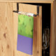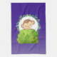 Serviette de cuisine avec dessin animé représentant un petit singe qui regarde derrière un buisson vert. Entouré d'une couronne de feuilles tropicaux. Placez-vous sur un arrière - plan de dégradé violet.