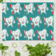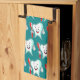 Serviette de cuisine avec l'illustration d'une grande dent blanche de style dessin animé souriant joyeusement en tenant une brosse à dents rouge et en donnant le signe pouce vers le haut. Arrière - plan vert foncé.