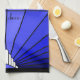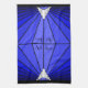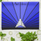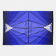 Un motif de style art déco classique en bleu. Un motif emblématique du soleil se levant derrière un bâtiment en forme d'art déco stylisé. Un design simple mais élégant, fidèle à l'époque.