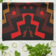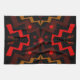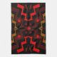 Cette serviette de cuisine américaine de couleur brillante MoJo dispose d'un motif abstrait primitif de foudre et de soleils dans les tons terre d'orange, rouge, noir et marron.