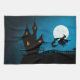 une sorcière volant sur son balai au clair de pleine lune avec une maison sombre en arrière-plan et un chat sur la clôture